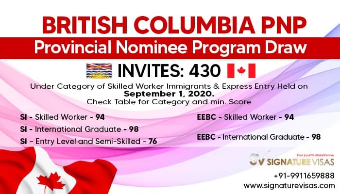 The latest provincial draw of the British Columbia Provincial Nominee Program (BC PNP) was announced on 1st September 2020, in which 430 applicants got selected for the provincial nomination for Canadian permanent residence. The occupations in tourism, hospitality, retail, and personal services were excluded from this Draw owing to the COVID 19 pandemic situation. The Applicants were selected from the Skilled Worker and International Graduate stream - Express Entry BC (EEBC), Skills Immigration (SI), and Entrepreneur streams.