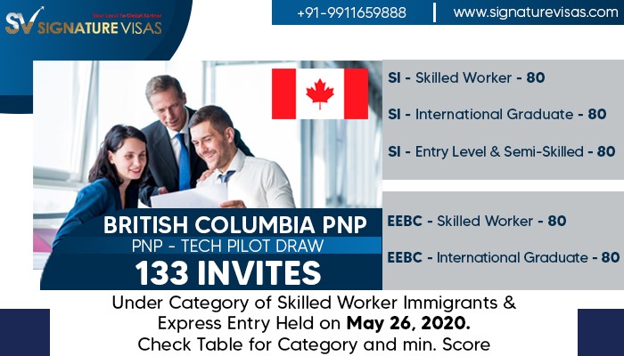 On 26 May 2020, the provincial nomination draw for British Columbia took place in which 133 candidates were invited. The applicants were invited to the Skilled Worker and International Graduate category under the skill immigration and express entry British Columbia pathway for immigration. The minimum required score for relocation in both categories was 80.